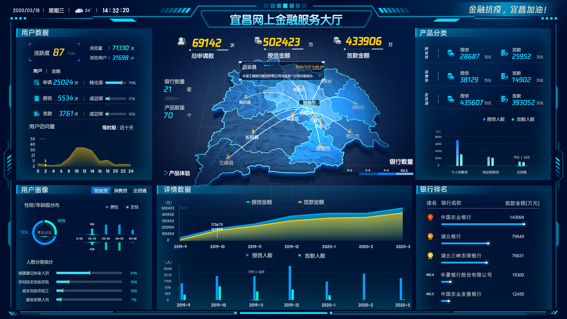 针对受疫情影响企业不同需求,“大厅”累计上线三峡农商行“抗击疫情专项贷”、邮储银行“抗疫应急贷”、湖北银行“复工复产助力贷”、中国银行“抗疫复工贷”等10款抗击疫情金融服务产品、灾后经济扶持贷款产品;针对一线抗疫医护人员上线三峡农商行白衣天使贴息活动;开发上线企业贷款续贷、展期、本息延期申请功能模块,与融资供给同步融合配套,助力企业纾解信用风险。