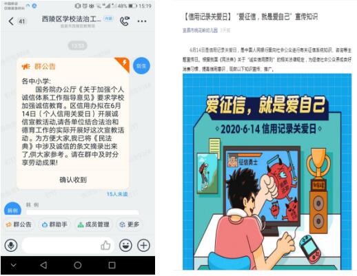 以各学校、幼儿园等教育行业为主要对象,通过钉钉群、微信群等开展了以“民法典”中诚信条文为重点的学习活动;