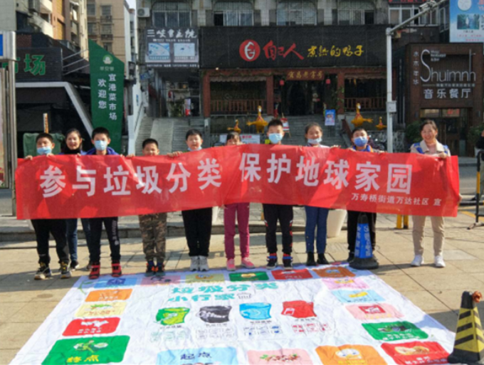 11月10日,伍家岗区万寿桥街道万达社区组织万寿桥小学的环保小小志愿者们,在万达二号门开展“参与垃圾分类 保护地球家园”的主题宣传活动。