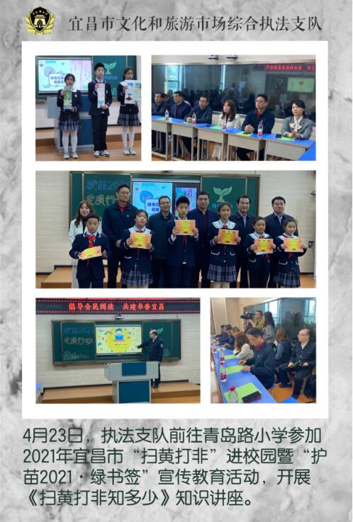 2021年4月23日,宜昌市“扫黄打非”办公室联合宜昌市教育局、宜昌市文化和旅游市场综合执法支队、市新华书店、宜昌高新区“扫黄打非”办公室、宜昌高新区管委会教育局举办2021年全市“扫黄打非”进校园暨“护苗•绿书签”宣传教育活动。
