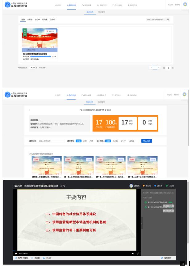 近期,宜昌市文化和旅游局按照文化和旅游部、省文化和旅游厅的安排部署,组织全市各级文化和旅游市场信用管理人员通过“全国文化和旅游市场在线培训系统”开展文化和旅游市场信用和质量培训。课程包括“关于旅游服务质量提升的认识与思路”、“诚信文化和传统内核与当代转化”、“提升信用经济认知,推动文旅市场高质量发展”、“信用监管的重大理论和实践问题”、“文化和旅游市场信用修复制度”、“信用标准化发展实践与方向”等6门课,共计17个学时。