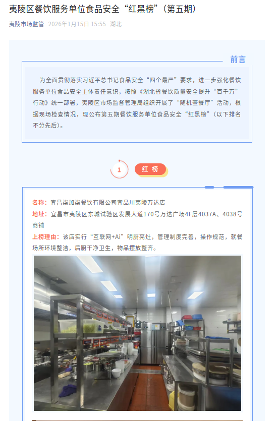 据悉,餐饮行业诚信“红黑榜”是夷陵区“食品安全监管扩面提升项目”的一个缩影,该项目由夷陵区政府牵头实施,是践行民生为本理念、以科技赋能食品安全监管的关键举措,被列为2026年度十大民生实事项目。项目为全区100家食品生产企业、100家小作坊、800家餐饮单位及400家食品流通经营主体,统一加装AI智能摄像头,实现食品加工全时监控,守护群众“舌尖上的安全”,擦亮夷陵食品安全与消费环境的诚信底色。