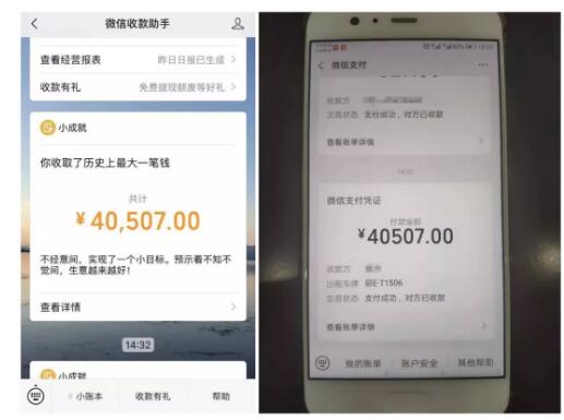 走出没20米,杨洪接到一条信息,称他“收取了历史上最大一笔钱”,金额为40507元,他坐在停在路边的车内,让自己冷静了一下,然后查看收款记录,确定就是刚才下车的乘客支付的。他马上赶回加油站四处寻找刚下车的乘客却没找到。这时,他给民富出租车公司经理打电话告之。