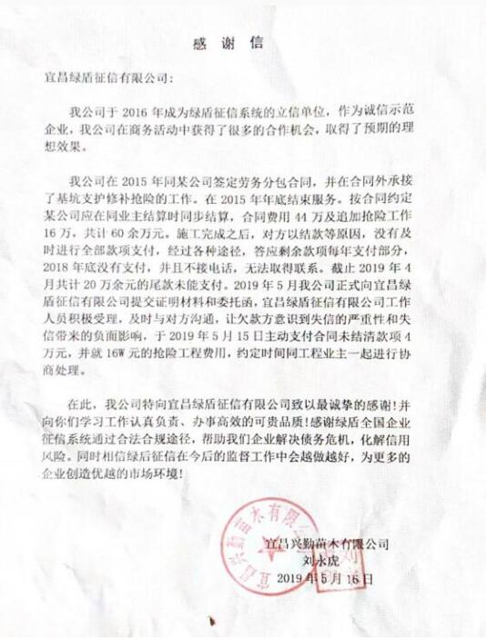 为表达对宜昌绿盾征信有限公司征信工作人员“信易收”服务的认可,兴勤苗木特意写给宜昌绿盾征信一封感谢信。