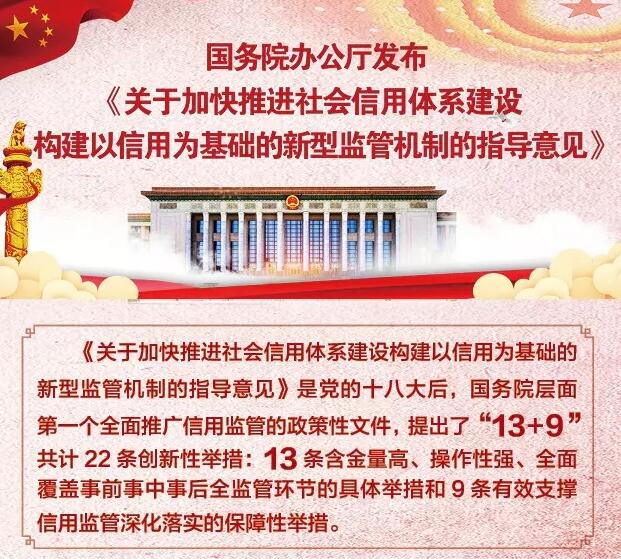国务院办公厅正式印发《关于加快推进社会信用体系建设 构建以信用为基础的新型监管机制的指导意见》。从事前、事中、事后均提出了具体举措和要求,有哪些亮点内容呢?《中国信用》杂志为此专门做了图解,赶紧来一睹为快!