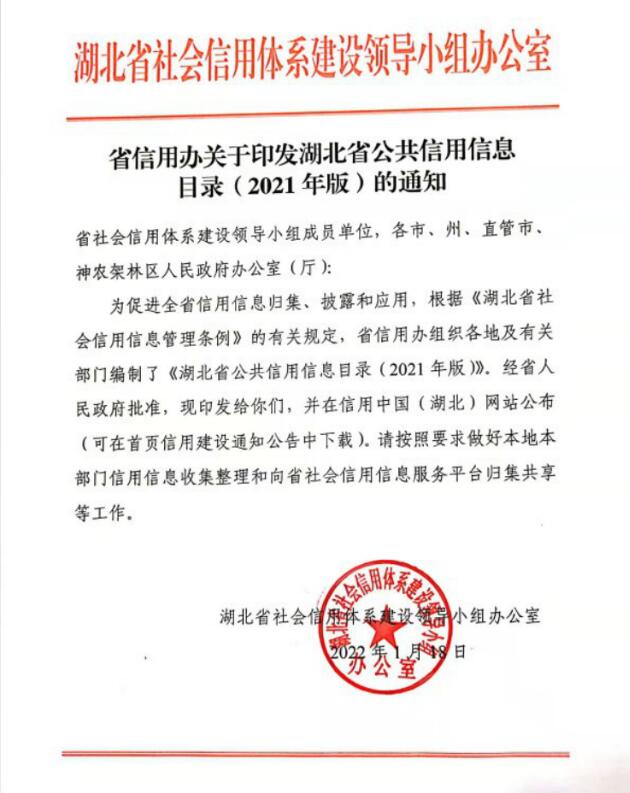 湖北省信用办关于印发湖北省公共信用信息目录(2021年版)的通知