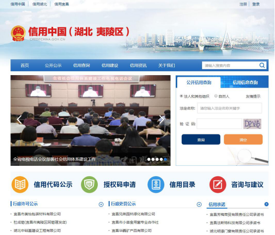 “信用夷陵”网站涵盖信息公示公开、信用查询、信用建设、信用资讯等栏目,其中“公示公开”板块中对行政许可、行政处罚信息进行了公示,并设置了信用红黑榜,惩戒案例等;“信用查询”板块,开放了信用信息查询通道,公众可通过该通道查询法人及其他组织的公开信用信息。法人和其他组织在实名认证后还可以查询自己的非公开信用信息和通过授权码授权他人查询自己的非公开信用信息。