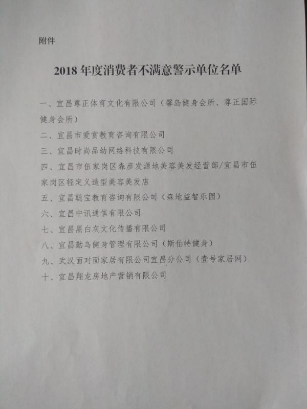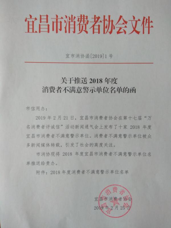 关于推送2018年度消费者不满意警示单位名单的函(宜市消协函[2019]1号)