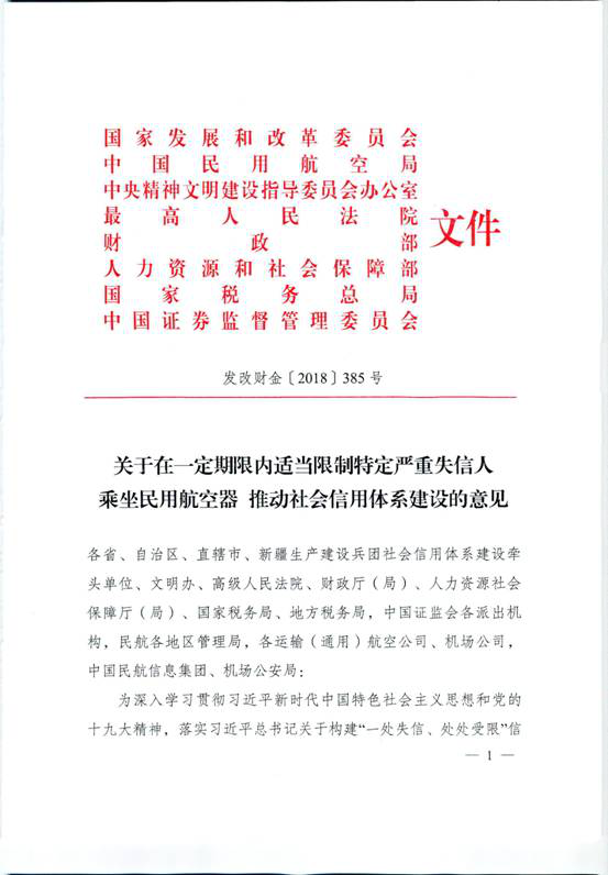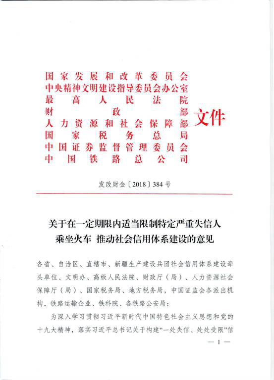 为建立健全守信激励和失信惩戒机制,进一步依法依规运用信用约束手段防范部分旅客影响铁路、民用航空运行安全,加大对其他领域严重违法失信行为惩戒力度,国家发改委、中央文明办、最高人民法院等部门联合制定印发了《关于在一定期限内适当限制特定严重失信人乘坐火车推动社会信用体系建设的意见》、《关于在一定期限内适当限制特定严重失信人乘坐民用航空器 推动社会信用体系建设的意见》。现转发给你们,请结合我市实际,认真贯彻执行。