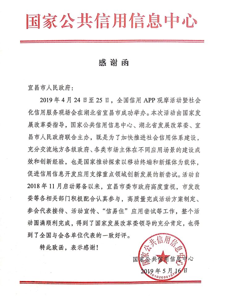 日前,国家公共信用信息中心发函宜昌市政府,对宜昌市政府、宜昌市发改委等相关部门在全国信用APP观摩暨社会化信用服务现场会期间所做的工作表示感谢。来函指出:“宜昌市委市政府高度重视,市发改委等各相关部门积极配合认真参与,高质量完成活动方案制度、参会代表接待、活动宣传、“信易住”应用尝试等工作,整个活动2019年4月24-25日在湖北宜昌举办,圆满顺利完成,得到了国家发展改革委领导的充分肯定,也得到了全国与会各单位代表的一致好评”。